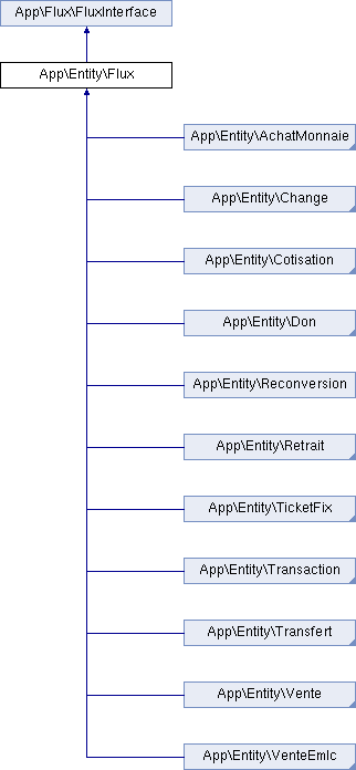 @ORM\Entity(repositoryClass="App\Repository\FluxRepository") @ORM\HasLifecycleCallbacks() @ORM\InheritanceType("SINGLE_TABLE") @ORM\DiscriminatorColumn(name="discr", type="string") @ORM\DiscriminatorMap({ "achat_monnaie" = "AchatMonnaie", "achat_monnaie_adherent" = "AchatMonnaieAdherent", "achat_monnaie_prestataire" = "AchatMonnaiePrestataire", "change" = "Change", "chg_pre_cpt" = "ChangePrestataireComptoir", "chg_adh_cpt" = "ChangeAdherentComptoir", "cotisation" = "Cotisation", "cotisation_adherent" = "CotisationAdherent", "cotisation_prestataire" = "CotisationPrestataire", "don" = "Don", "don_adherent" = "DonAdherent", "don_prestataire" = "DonPrestataire", "retrait" = "Retrait", "ret_cpt_adh" = "RetraitComptoirAdherent", "ret_cpt_pre" = "RetraitComptoirPrestataire", "transaction" = "Transaction", "tro_adh_pre" = "TransactionAdherentPrestataire", "tro_adh_adh" = "TransactionAdherentAdherent", "tro_pre_adh" = "TransactionPrestataireAdherent", "tro_pre_pre" = "TransactionPrestatairePrestataire", "transfert" = "Transfert", "tre_cpt_grp" = "TransfertComptoirGroupe", "tre_grp_cpt" = "TransfertGroupeComptoir", "tre_pre_sie" = "Reconversion", "tre_sie_grp" = "TransfertSiegeGroupe", "tre_grp_sie" = "TransfertGroupeSiege", "vente" = "Vente", "vte_cpt_pre" = "VenteComptoirPrestataire", "vte_cpt_adh" = "VenteComptoirAdherent", "venteemlc" = "VenteEmlc", "vte_emlc_cpt_adh" = "VenteEmlcComptoirAdherent", "vte_emlc_cpt_pre" = "VenteEmlcComptoirPrestataire", "ticket_fix" = "TicketFix", "ticket_fix_print" = "TicketFixPrint", "ticket_fix_destroy" = "TicketFixDestroy", })